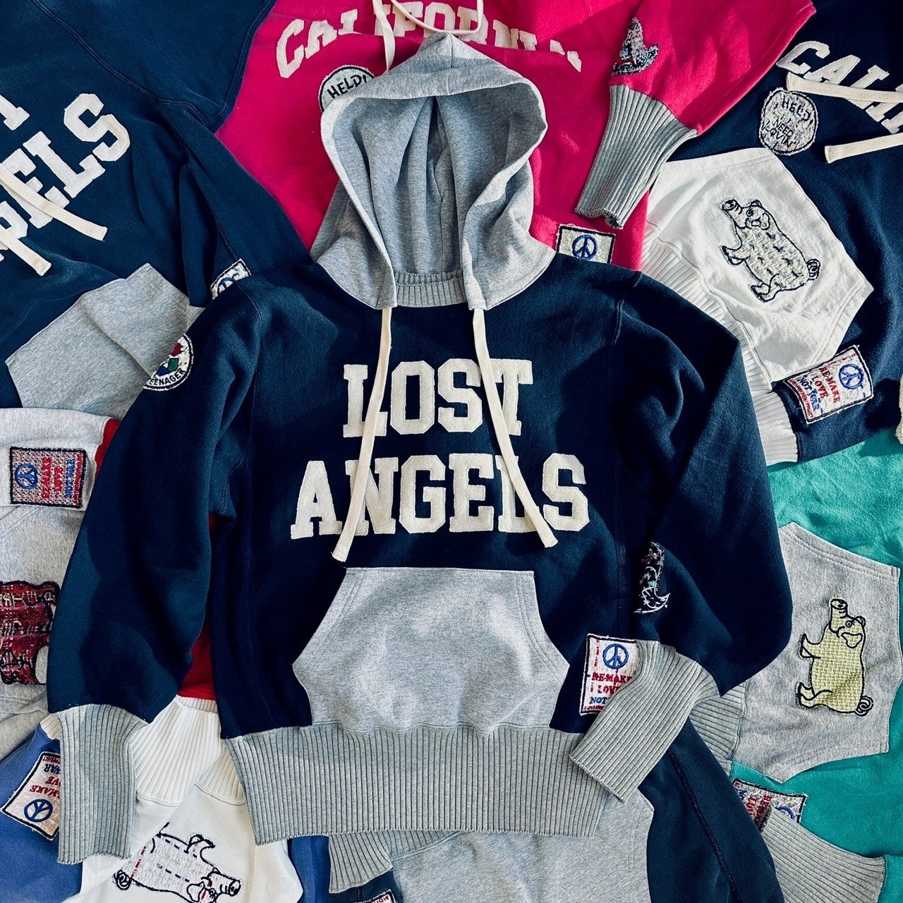 風合いの良いビンテージスウェットを解体し、古くなった襟や袖のリブを Perfect ribs®に付け替え、汚れや穴などは A LOVE MOVEMENT 大久保鉄三氏に よりパッチカスタムを施した世界で一つだけのスペシャルコレクションです。デザインは大久保氏が感じたインスピレーションを、色彩豊かな文字やオリジナルパッチで表現します。