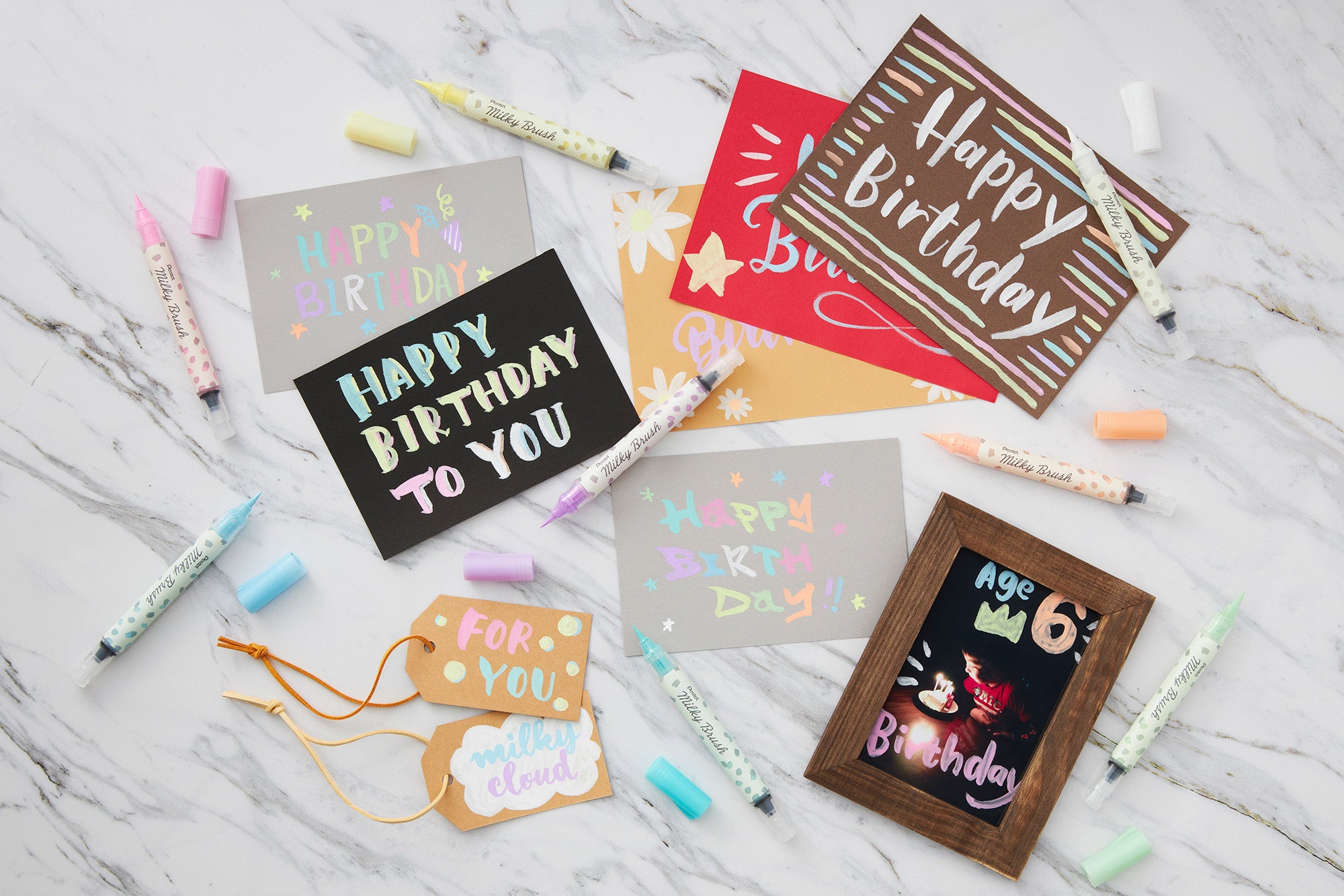 2022年9月に新発売した「ミルキーブラッシュ」は、1996年に発売し人気を博したボールペン「ハイブリッドミルキー」のインキを搭載した、ブラッシュタイプのパステルカラー筆ペンです。カラー筆ペンの中でも珍しい不透明のパステルカラーで、クラフト紙や濃い色の紙に書いても、インキがしっかりと乗り、キレイに発色します。