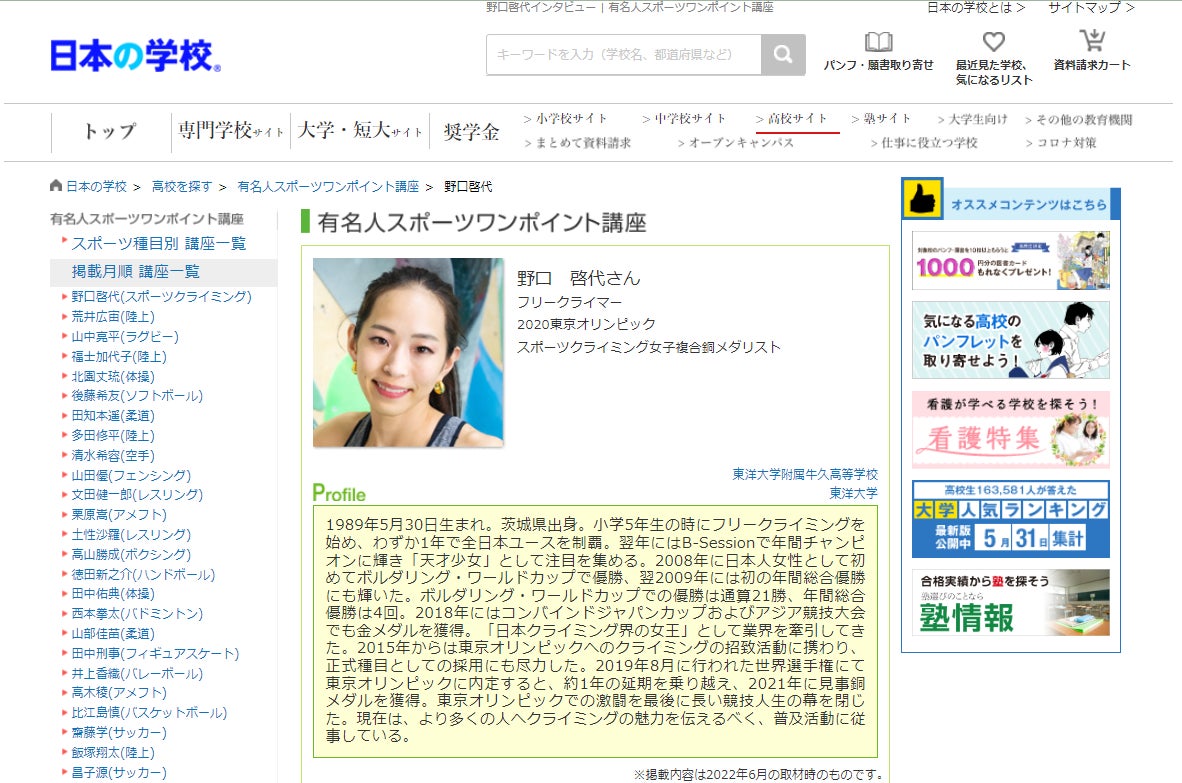 全国の大学・短大・専門学校などの学校情報を提供する、株式会社JSコーポレーション(本社:大阪市北区 代表取締役社長:米田英一)は、スポーツワンポイント講座「フリークライマー/野口啓代さん」
