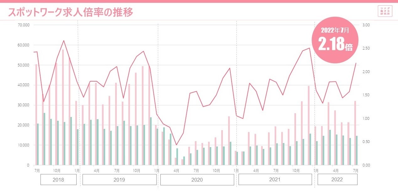 1.単発、短時間、短期間で働くスポットワークの2022年7月度求人倍率は2.18倍