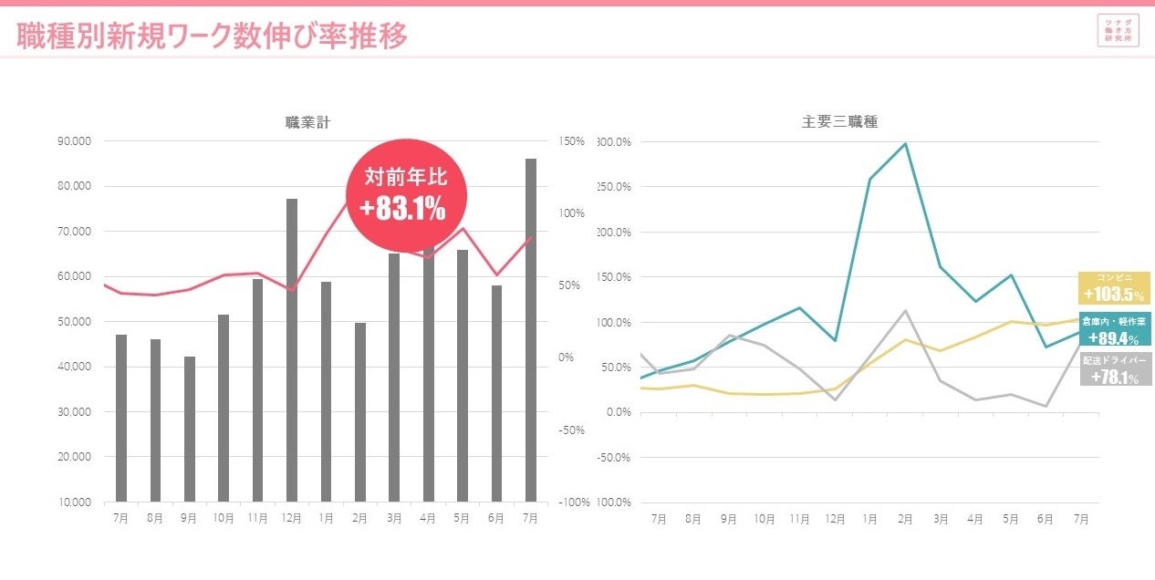 2.新規ワーク数は、対前年比で+83.1%。主要職種ではコンビニスタッフが+103.5%と伸長