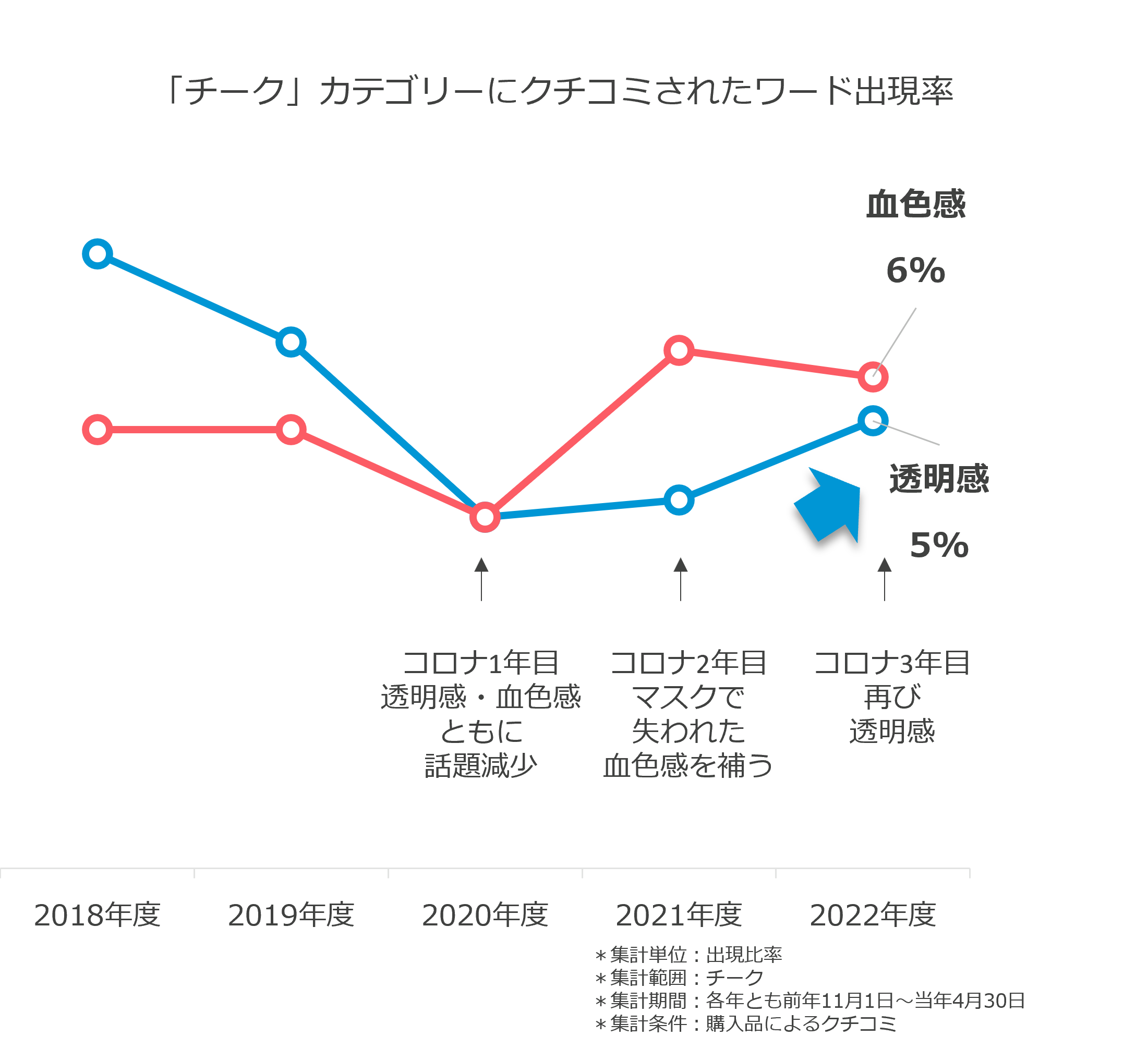 新型コロナ感染拡大以降、生活者は二年をかけて少しずつコロナ禍、マスク生活に適応してきました。一年目は、外出自粛やマスク着用によるメイク機会の減少からスキンケアに注力、二年目ではマスクにつきにくいリップやベースメイクアイテムを取り入れるなど工夫を重ねてきました。