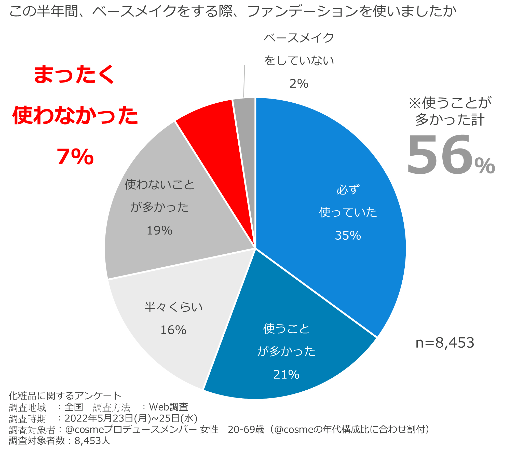 ユーザーアンケートでも、半数がこの半年間で「ファンデーションが薄くなった/しなくなった」と回答しています。その一方でベースメイクをする際、ファンデーションを「全く使わなかった」と回答した人は1割以下にとどまりました。「ノーファンデ」というワードが先行しがちですが、実際は「頻度を減らす」「塗る量や塗る部分を調整する」人が多いという実状がうかがえます。