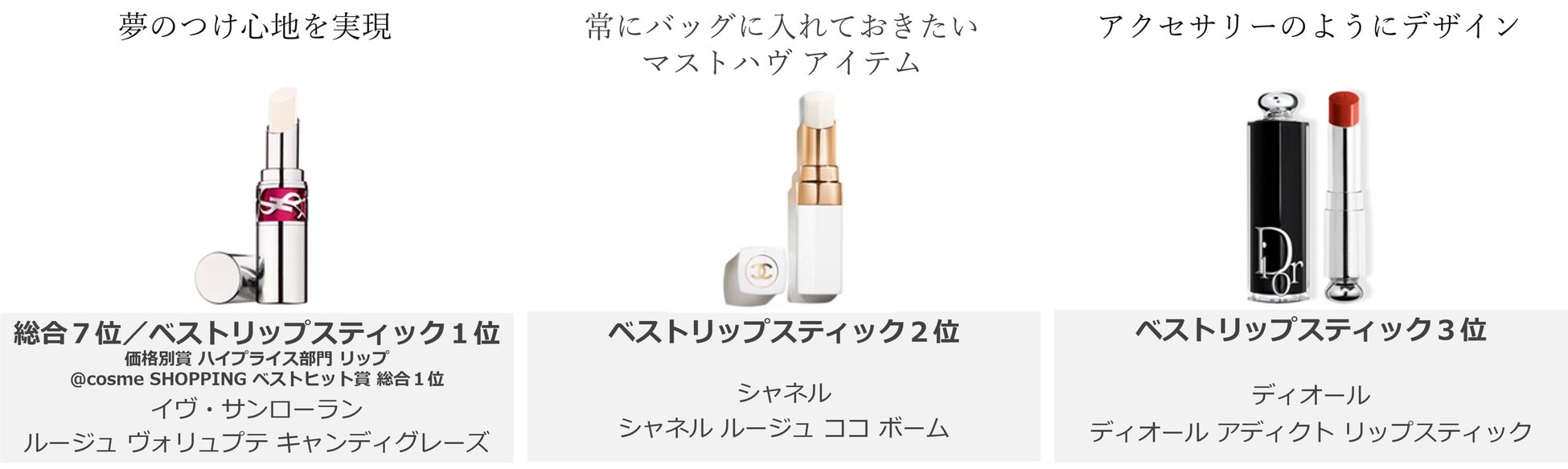 昨年は総合10位以内にマスクにつきにくいと謳い、その点が評価されたティント系リップがランクインしていたのに対し、今年は「塗り心地の良さ」「パッケージの可愛らしさ」「持っているだけで気分が上がる」といった点で評価されているイヴ・サンローラン「ルージュ ヴォリュプテ キャンディグレーズ」が総合7位にランクインしていることも、機能やマスクへの色の移りだけに縛られず、「持っていて心地の良い口紅を持つ」という化粧品のエモーショナルな部分を楽しむ気持ちを取り戻しつつあることのあらわれともいえ、これからはリハビリとしてのノーカラーではなく、口紅にも徐々に色味が戻ってくるかもしれません。