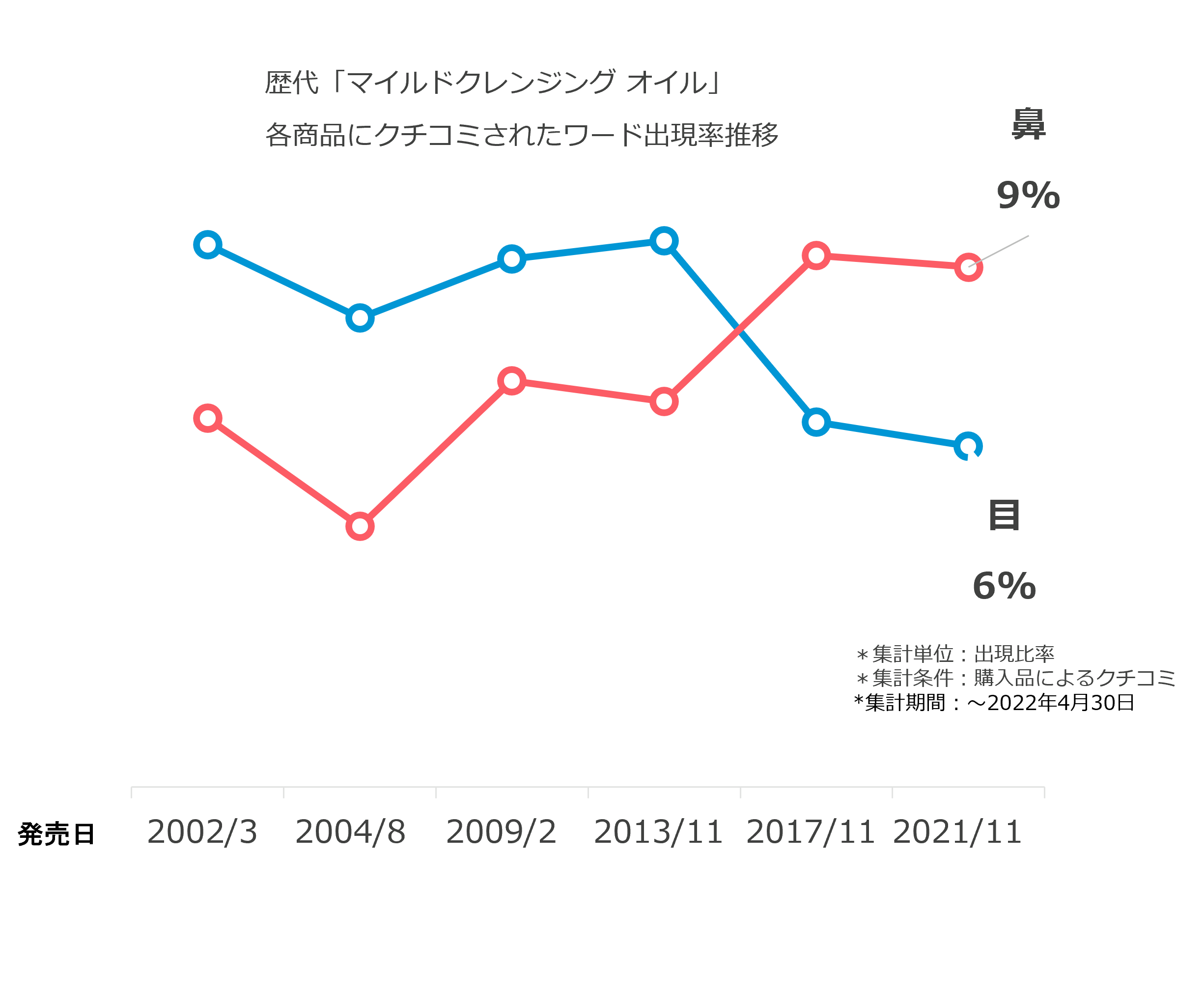 本商品のクチコミには「落ちる」「優しい」「うるおう」「こすらない」「なじむ」「すっきり」などリニューアルに関わらず常に高く評価されるポイントが多数あり、期待を上回るリニューアルと受け取られていることが分かります。