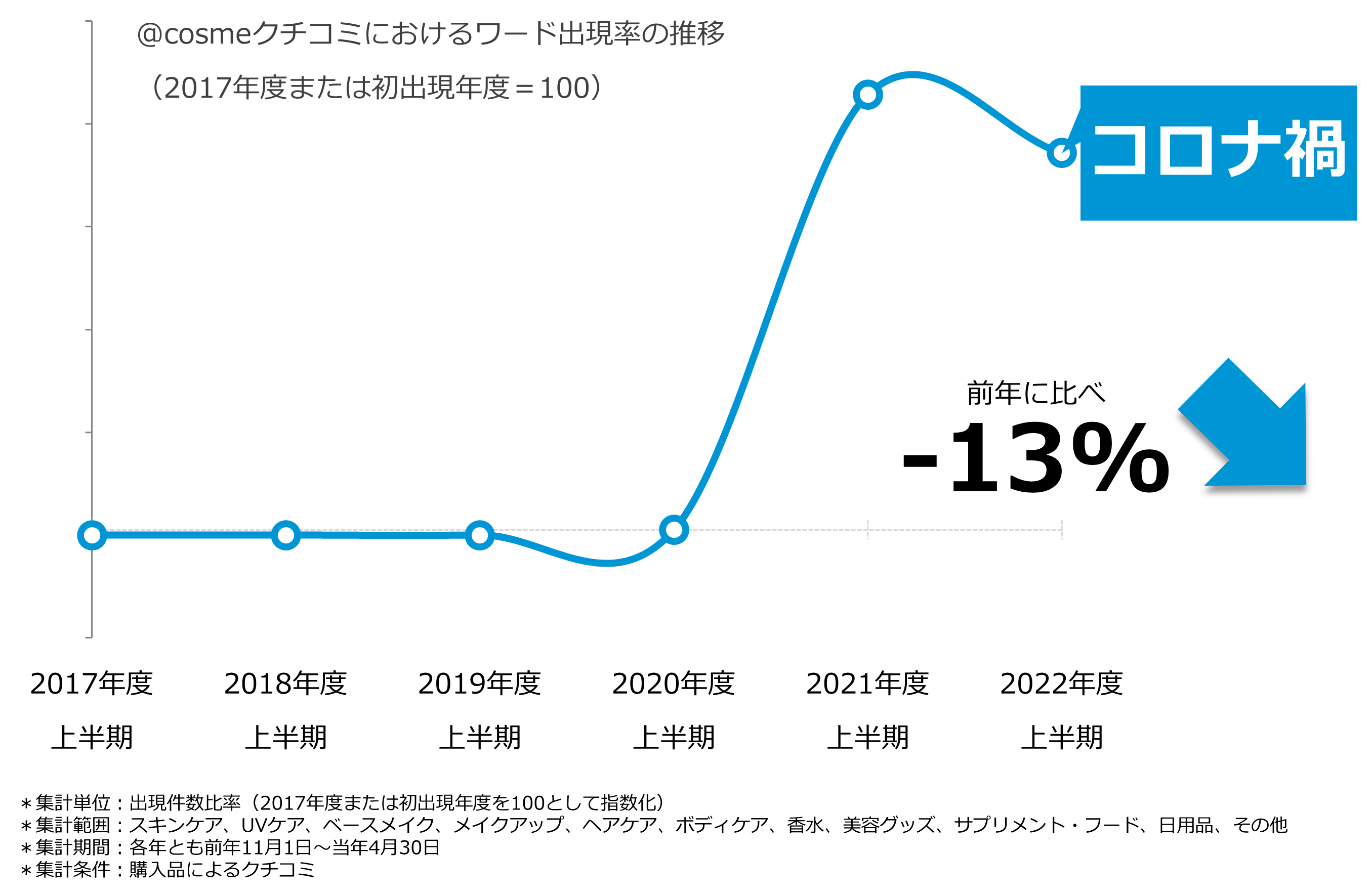 「@cosmeベストコスメアワード2022 上半期新作ベストコスメ」集計対象期間となる2021年11月1日~2022年4月30日は、オミクロン株の感染拡大による「第6波」から、まん延防止措置の全面解除など、わずか半年間で大きな状況の変化がありました。まん延防止措置の解除以降は、徐々に街にも賑わいが戻り始め、@cosmeのフラッグシップショップ「@cosme TOKYO」では、全体の売り上げが大幅に増加しています。同期間に@cosmeに投稿されたクチコミを見ると、「コロナ禍」や「マスク」というワードの出現率が減少に転じており、生活者の気持ちが前向きに変化しつつあると感じられます。