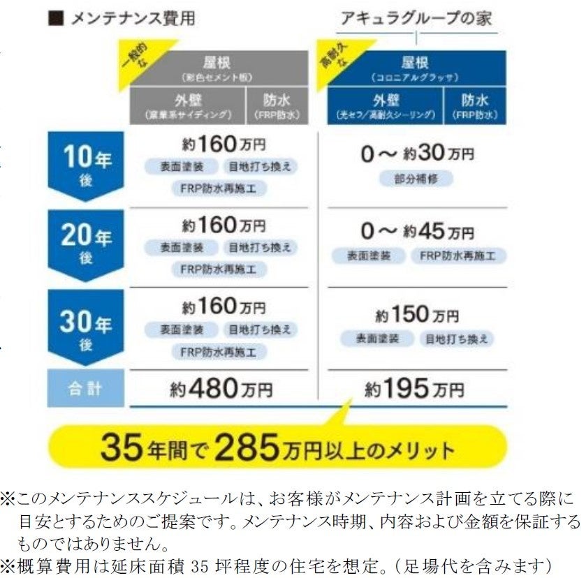 住宅の定期的な点検は人間の健康診断同様、永く良い状態を保つために非常に重要です。アキュラホームグループは「永代家守り」の精神から、建てた後にも定期的な訪問を実施し、お手入れ方法のレクチャーや点検を実施してまいりました。このお施主様との永いお付き合いによる確かな実績から、「超空間の家Neo」は、構造上主要な部分(基礎・土台・柱など)と雨水の侵入を防止する部分(屋根・外壁・ベランダなど)の保証期間を法律で定められる10年から20年に延長します。これにより35年間で285万円以上のメンテナンスコスト削減を実現します。今後も「永代家守り」の精神から長期間に渡り、お客様の豊かな暮らしを守り続ける取り組みを継続してまいります。