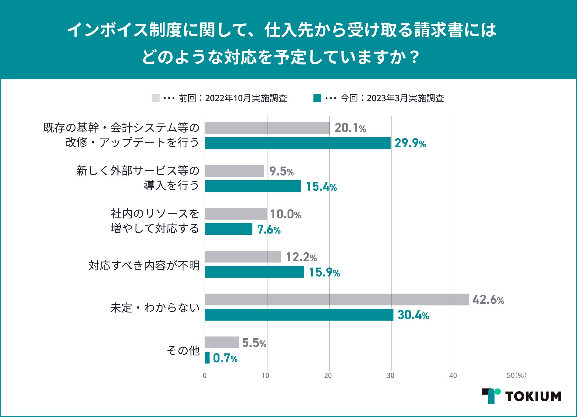 また、「既存の基幹・会計システム等の改修・アップデートを行う」が29.9%となり、前回の調査結果と比較して9.8ポイント増加しました。「新しく外部サービス等の導入を行う」も15.4%で、昨年より5.9ポイント増加し、システムを活用した対応を選択する企業が増えています。