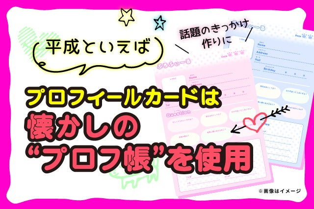 プロフィールカードではなく、かつて大流行した「プロフ帳」を使用して交流します。趣味や好きな音楽、理想の休日などを書き込んだプロフ帳を交換しながら、自然に会話が盛り上がります。店内では平成ヒットソングが流れ、平成世代の共感を呼ぶ仕掛けが満載です。