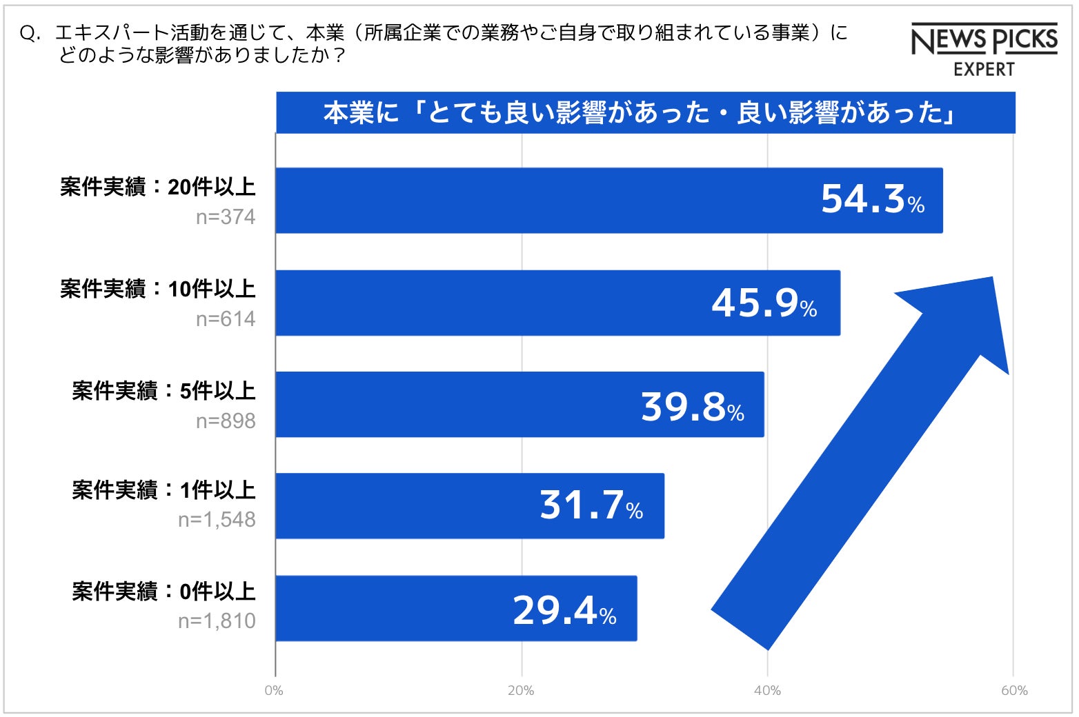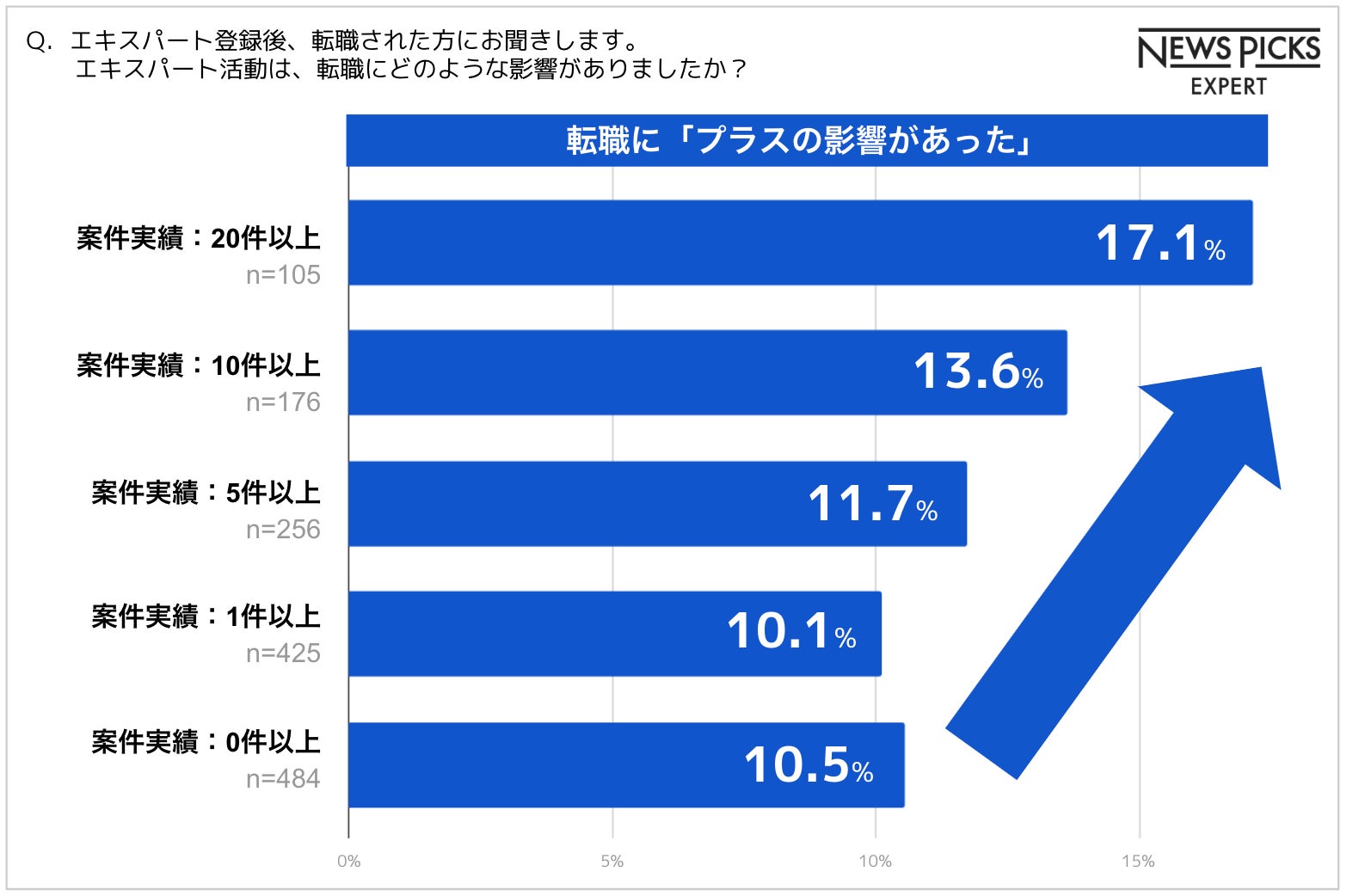 また、エキスパート活動の案件実績件数が多い方ほど、転職に「プラスの影響があった」と答える割合が高くなる傾向も見られました。