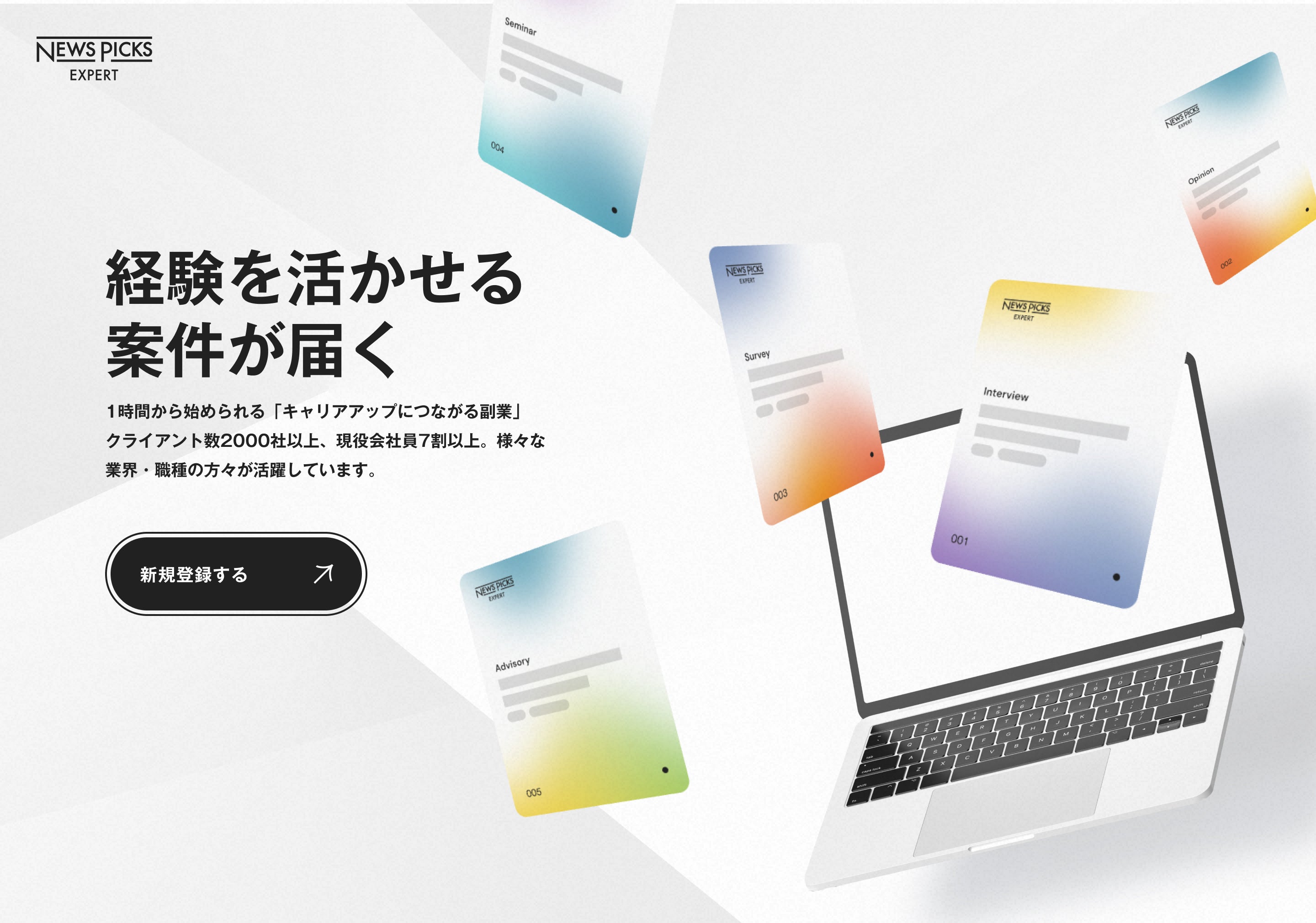 ミーミルは、「NewsPicks Expert」の登録サイトを本日リニューアルオープンしました。「経験を活かせる案件が届く」をキャッチコピーに設定し、登録や活動のイメージを分かりやすく感じていただけるよう、デザイン、レイアウト、コンテンツを一新しました。実際に活躍されているエキスパートの声や、登録者が持っている知識に価値を感じているクライアントの声も新たに掲載しています。
