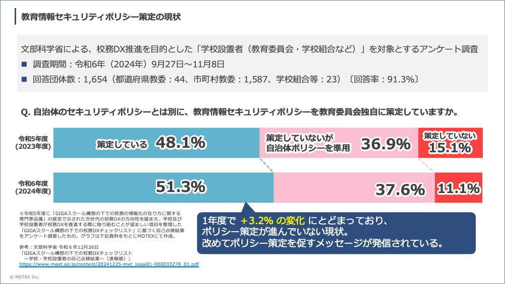 しかし、令和6年(2024年)末の調査(※2)では、ポリシー策定済みの団体は対象の約半数にとどまっており、同省は補助金や支援制度の整備を推進しつつ、改めて策定を促しました。直近の令和7年(2025年)3月には、同ガイドラインが改訂され、各教育委員会には一層の情報セキュリティ対策強化が求められている状況です。