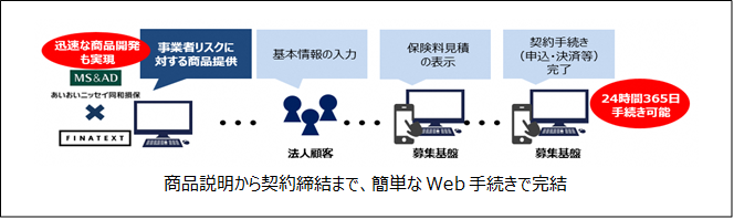 MS&AD インシュアランスグループのあいおいニッセイ同和損害保険株式会社(代表取締役社長:新納 啓介 以下「あいおいニッセイ同和損保」)と株式会社Finatext(代表取締役CEO:木下 あかね 以下「Finatext」)は、これまで個人向け保険が中心だったWeb完結型のデジタル募集基盤(※1)(以下、個人向けデジタル募集基盤)をベースに、業界に先駆けて新たに法人向けに特化した基盤を共同開発し、2022年4月に第一弾商品「ミニサイバー費用保険」を多くの顧客基盤を持つ事業者(プラットフォーマー)さま向けに提供開始します。