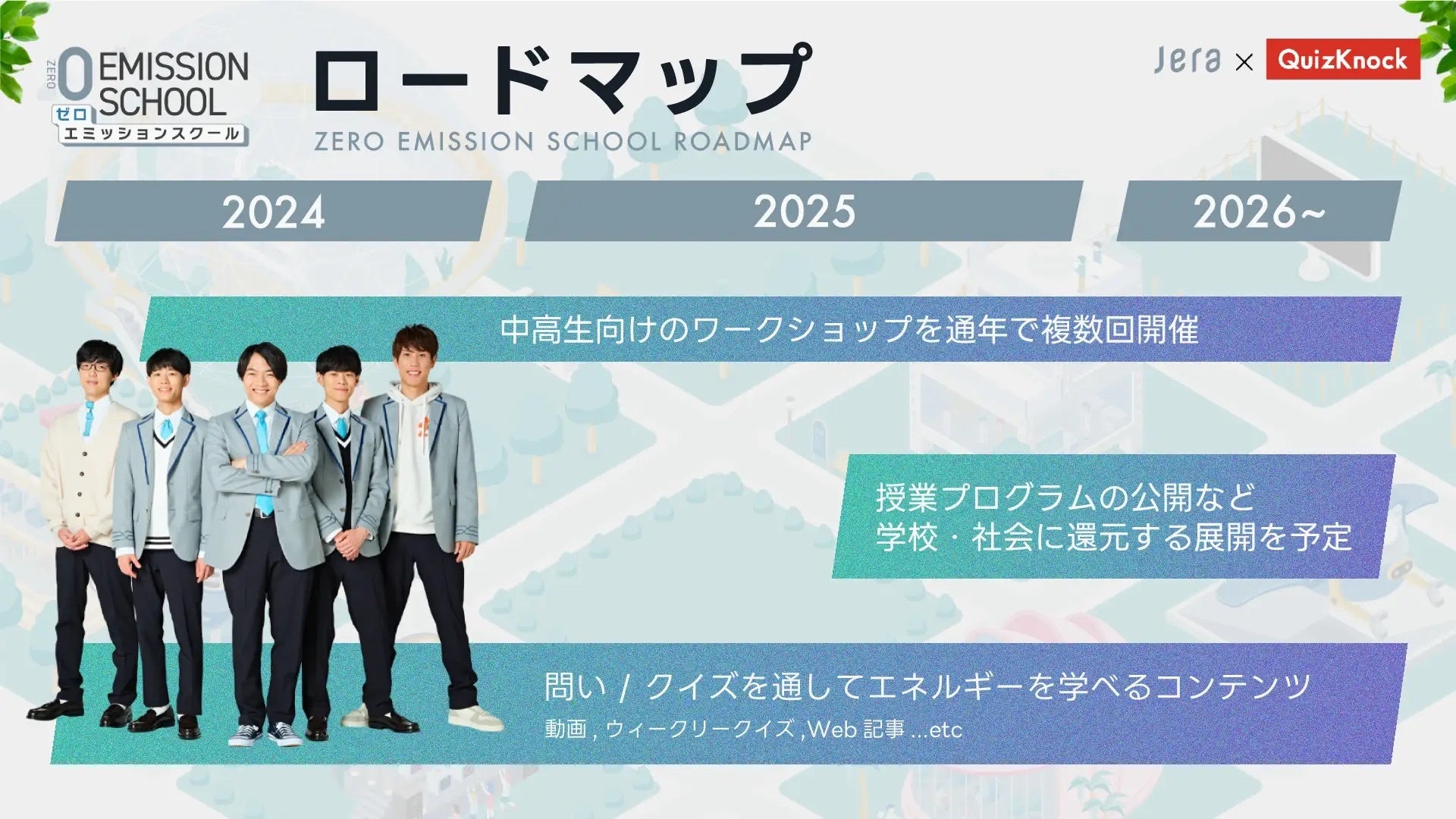 QuizKnock と JERA が協働で取り組む中高生向けの次世代教育プロジェクト「ゼロエミッションスクール」は、今後もエネルギーに関する情報発信に加えて、学生および学校関係者の皆さまとの対面型ワークショップの開催、さらには教育現場向けプログラムや教材の開発・制作も視野に入れて多角的に展開していく予定です。詳しくは特設サイト( https://zero-emission-school.jp/ ) をご確認ください。