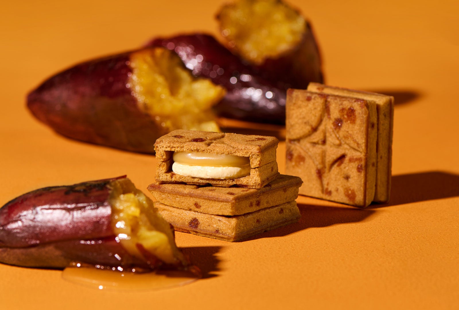 国産の安納芋ペーストやパウダー(※)を使用した、ねっとり食感の蜜芋バターキャラメルと濃厚な蜜芋バタークリームをたっぷりサンド。蜜芋の甘みと溶け合うバターの相性が美味しさの要です。サクサクのクッキーには、蜜芋の皮から溢れる蜜を表現するためカラメルチップを練り込み、キャラメリゼされたような照りっとした見た目とカリッと香ばしい食感に仕上げています。さらにメープルシュガーも練り込むことで、秋冬にぴったりの深みある味わいに仕上げました。