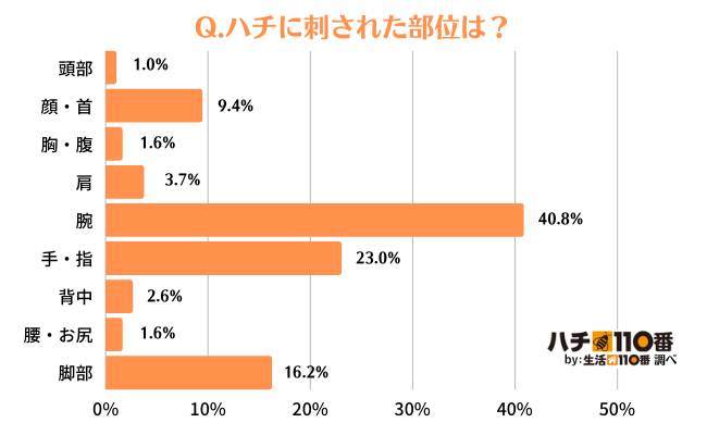 ハチに刺された状況に続いて、ハチに刺された身体の「部位」についても調査しました。