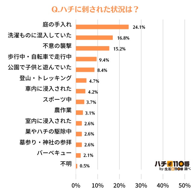 結果は、「庭の手入れ」中にハチに刺された回答者が全体の24.1%を占め、ハチに刺された状況として最多となりました。