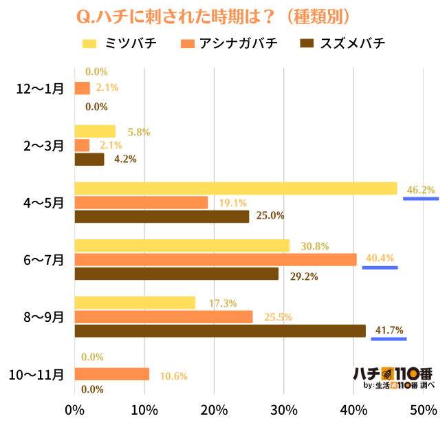 また、アシナガバチに関しては年間通して被害が確認されていることも注意が必要です。