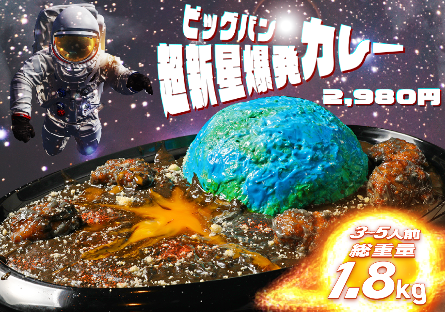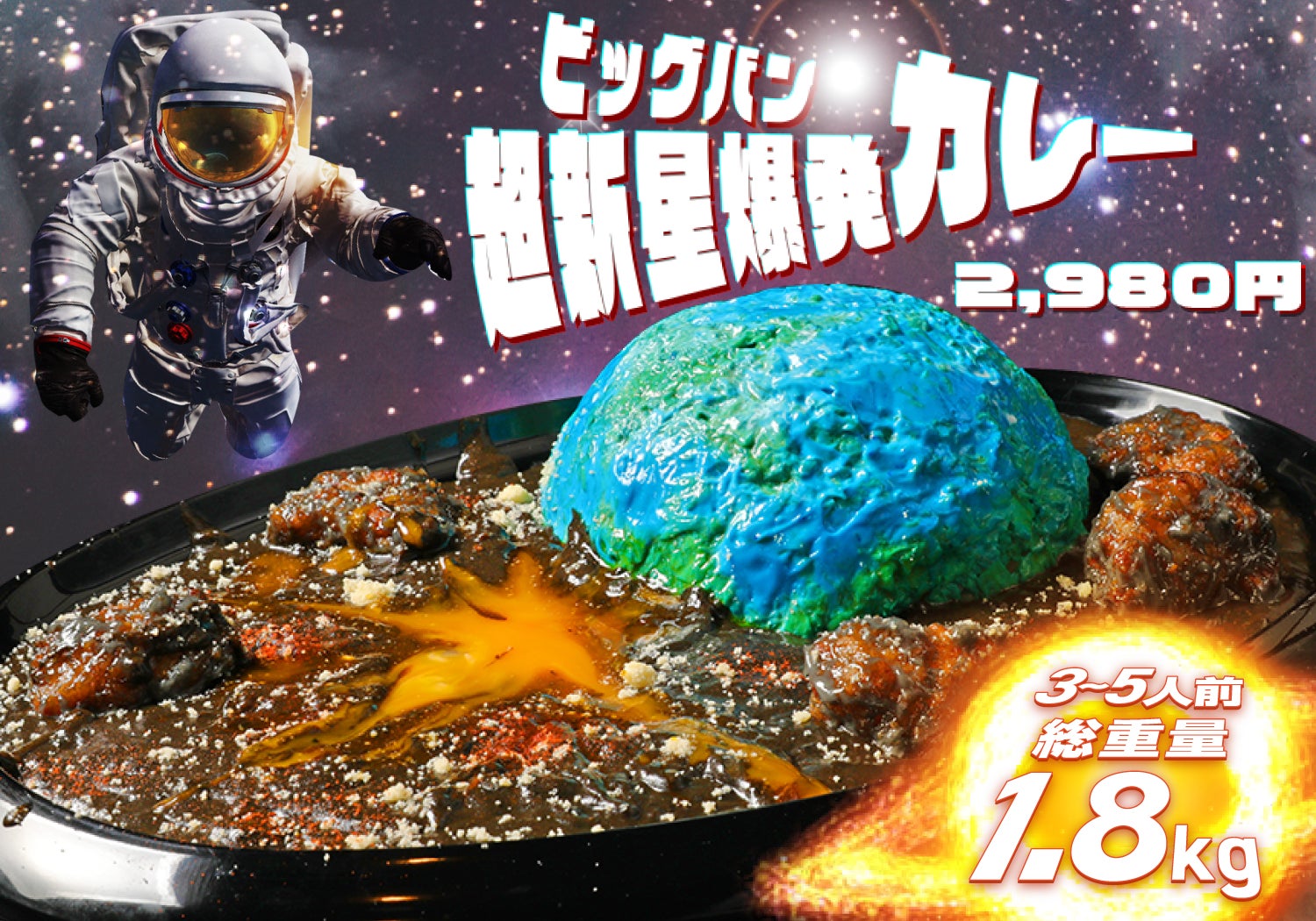 京都の学生たちに「お腹がはちきれんばかりのSURPRISE」を提供するべく新メニューを開発しました。その名も『超新星爆発(ビッグバン)カレー』。