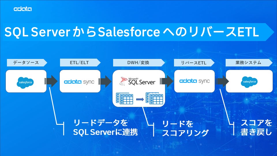 SAP とSalesforce のデータをSQL Server で統合してスコアリング、Salesforce に書き戻す。https://www.cdata.com/jp/kb/tech/sap-sync-sql-salesforce.rst