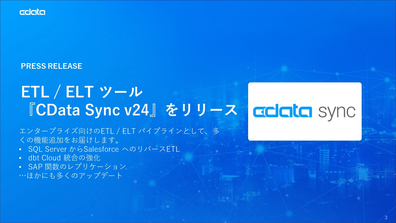 2024年5月30日、CData Software Japan 合同会社(本社:アメリカノースカロライナ州、日本オフィス:宮城県仙台市、代表社員 職務執行者:疋田 圭介、以下CData)は、クラウド・DB データのETL / ELT データパイプラインツール『CData Sync』のV24 のリリースを発表しました。事前にリリースしたフルマネージド版の『CData Sync Cloud』のほか、SQL Server からSalesforce へのリバースETL、dbt Cloud の認証種類の拡張、SAP 関数の同期先へのレプリケーションなどの機能追加を行っています。