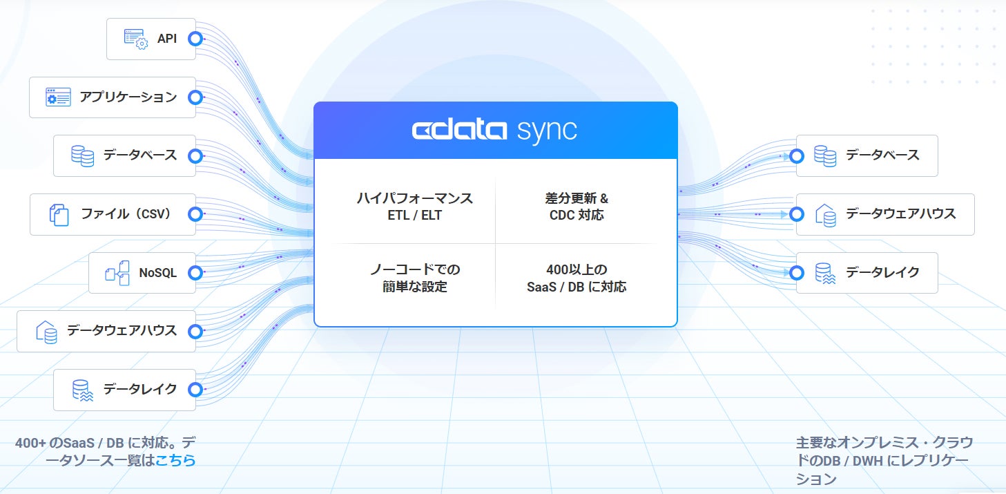 CData Sync は、あらゆる業務データをデータ分析のためのデータウェアハウス(DWH)に効率的にロードできるETL / ELT ツールです。400種類以上のSaaS・DB からのデータ取得に対応し、シンプルで高機能なツールとして多くのエンタープライズ企業に利用されています。今回のV24 では、SaaS 提供版の『CData Sync Cloud』のリリース(https://www.cdata.com/jp/news/20240513-sync-cloud/)に加え、以下のような機能追加を行っています。