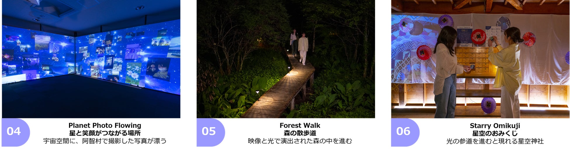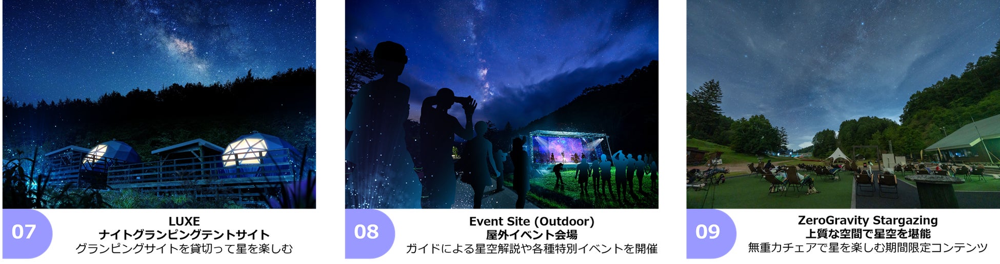 星空をテーマとした映像や光の演出が皆様をお迎えするEntrance Zone(エントランスゾーン)、ガイドによる星空解説や、森を歩きながら新たな発見をするExperience Zone(体験ゾーン)、静かに星空を眺めるSilent Zone(静寂ゾーン)があり、場内を巡り星空のエンターテインメントパークをお楽しみいただけます。