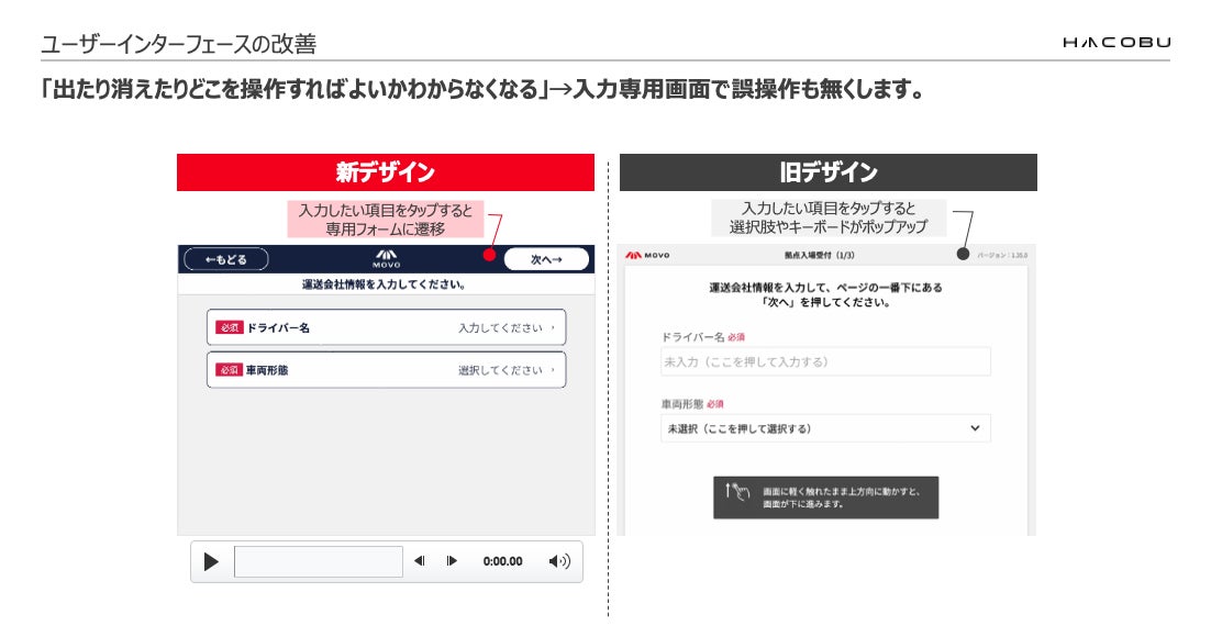 MOVO Berthはユーザーからの要望を受け、操作性を向上させるために受付画面のデザインを刷新しました。デザイン刷新により、ドライバーがより簡単に操作できるようになりました。操作性の向上により、物流現場の業務効率化に向けた支援を加速します。