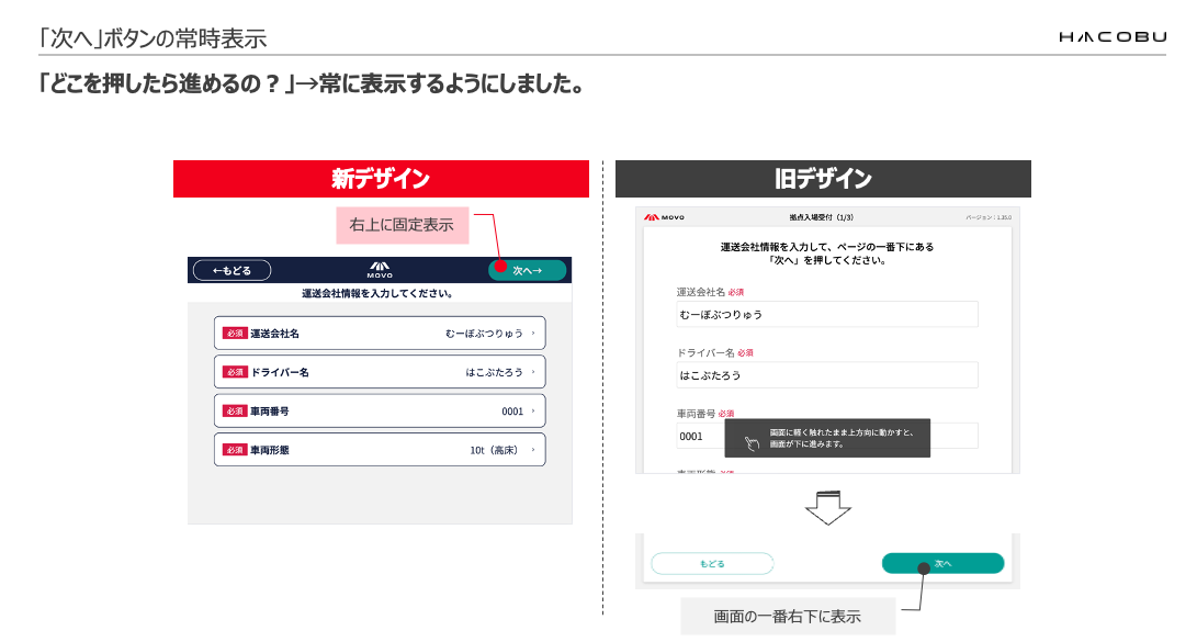 新デザインでは、常に画面上部に「次へ」ボタンを表示し、画面遷移をしやすくしました。
