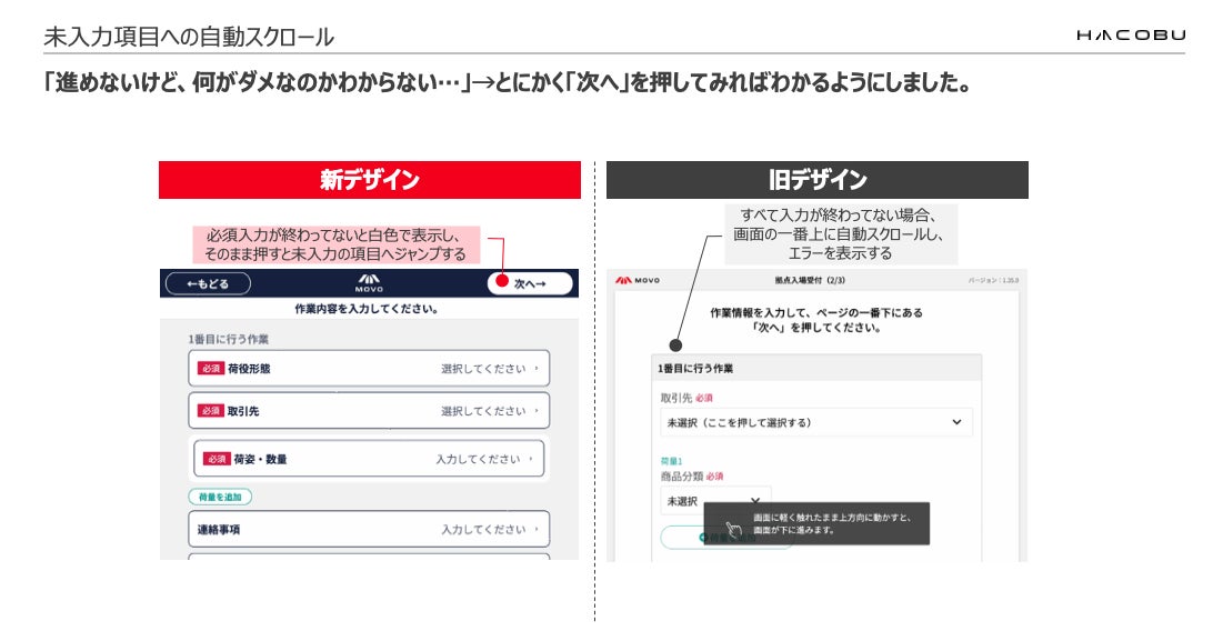 未入力項目がある場合、自動的にその位置までスクロールする機能を追加しました。これにより、どの項目が未入力なのかが一目で分かります。