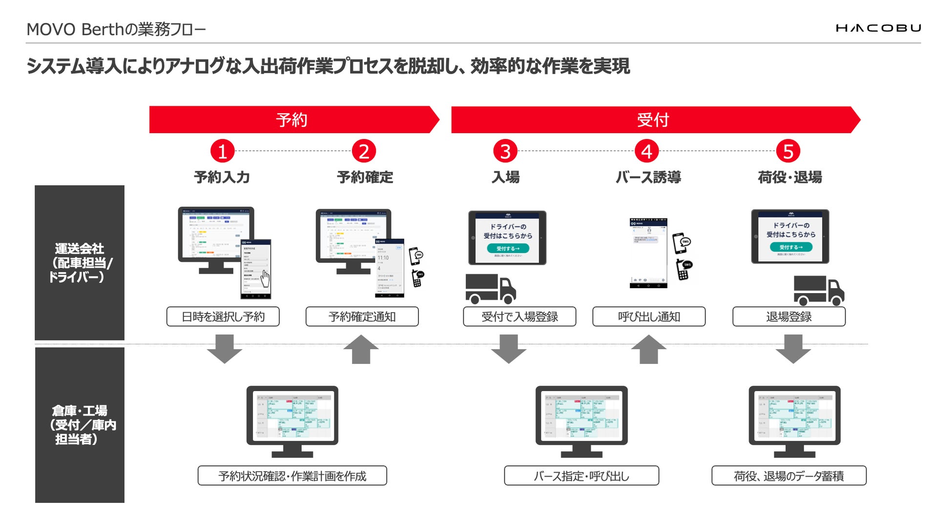 Hacobuが提供する「MOVO Berth」は、荷待ち・荷役時間の削減や物流現場の生産性向上を実現するトラック予約受付サービスです。入場予約・入退場受付によって、物流センター・工場における荷待ちの改善や生産性向上を支援します。車両の入場時間を分散し、計画的な入出荷作業で荷待ち問題を解決します。