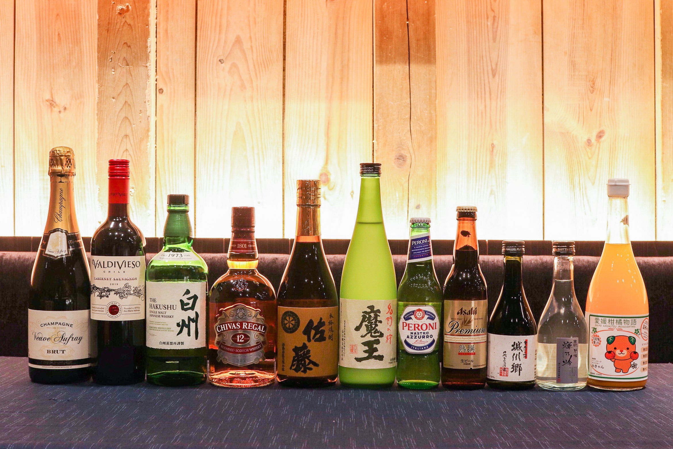 非日常な時間に相応しいシャンパンでの乾杯や、ワイン・ビール・日本酒はもちろん、お酒が苦手な方にはソフトドリンクをご用意。中でも愛媛県産の温州みかんを使ったソフトドリンクは酔い覚ましの一杯に。地酒や地元名産のドリンクを是非一度ご堪能ください。