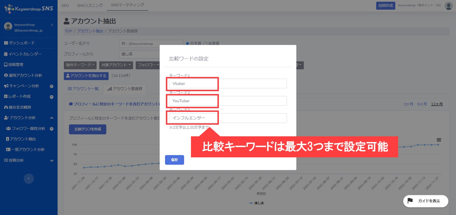 最大4つまでキーワードを追加し、複数のキーワードでアカウント数の推移を比較することも可能です。
