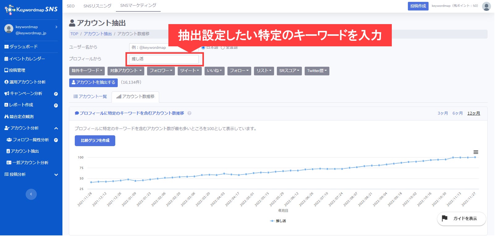 Keywordmap for SNSのアカウント分析にアカウント数の推移が把握できるグラフを実装