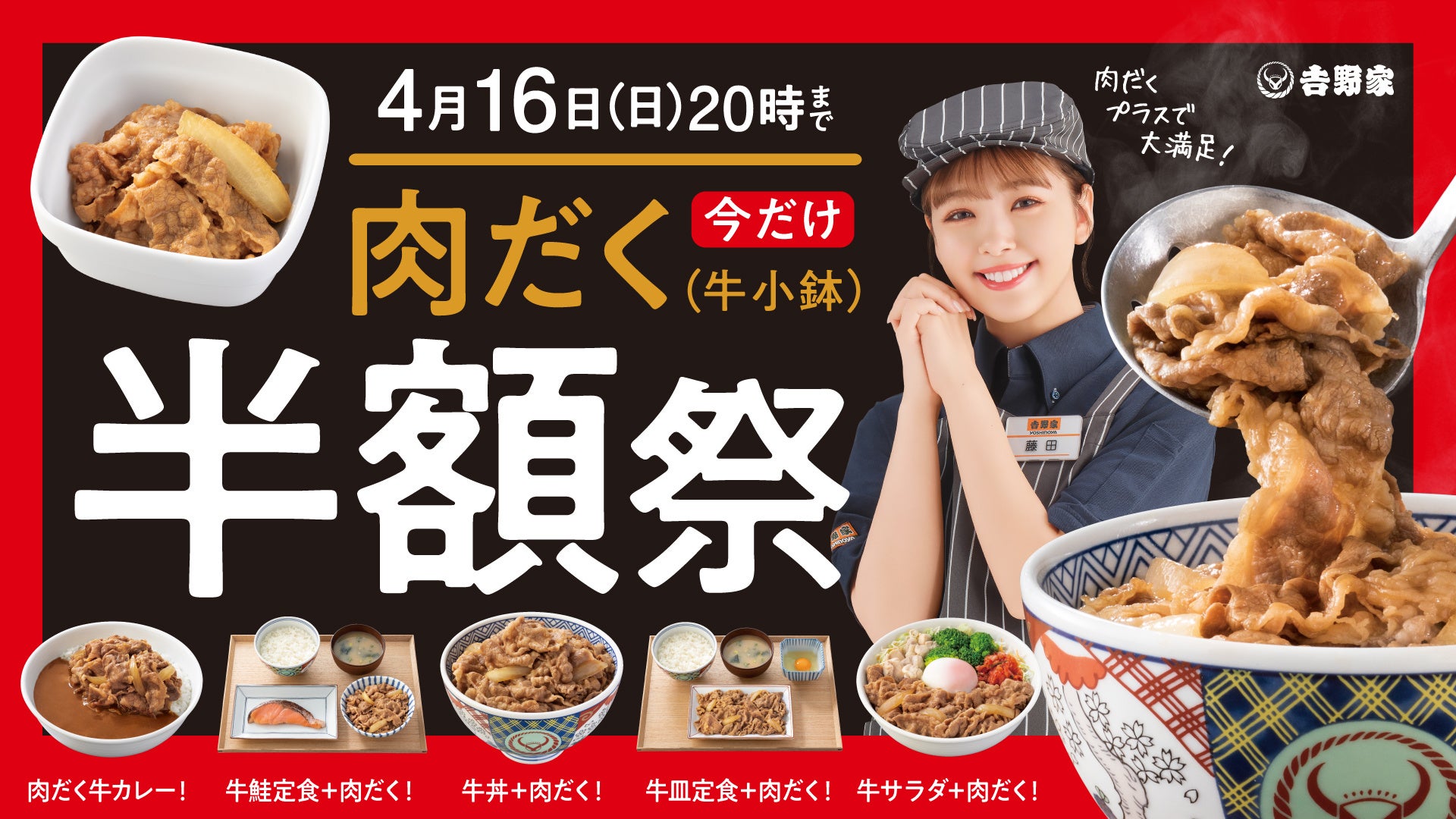 株式会社吉野家(本社:東京都中央区、代表取締役社長:河村泰貴、以下吉野家)は、4月3日(月)11時から4月16日(日)20時まで全国の吉野家店舗※1にて、「肉だく(牛小鉢)」を税込価格の半額で提供するキャンペーン『肉だく半額祭』を実施します。