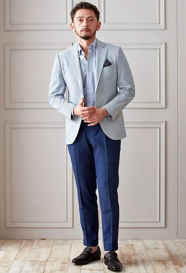涼しげな質感のシアサッカーの生地に、爽やかなブルーストライプが入ったスタイル。