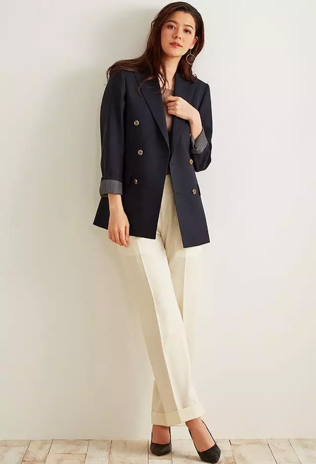 ジャケットの襟は、ダブルスーツで多く採用さあれるピークドラペルをチョイス。人気の紺ブレスタイルでオフィスカジュアルに最適。
