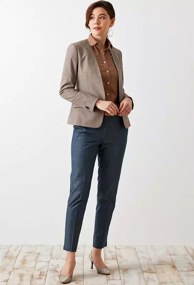 ベージュをベースとした細かいマイクロチェック柄のジャケットにデニム調のパンツを合わせ、こなれ感を演出。
