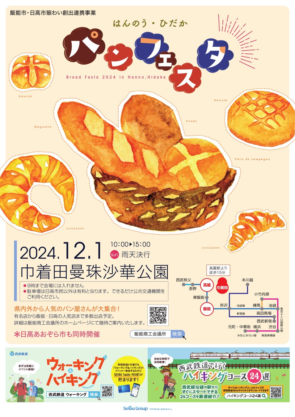埼玉県飯能市・日高市内外の人気パン店が集結するパンの祭典「はんのう・ひだかパンフェスタ」が令和6年12月1日(日)に、日高市の巾着田曼珠沙華公園で開催されます。