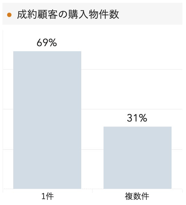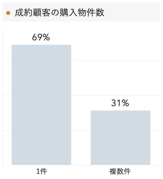 3月度成約顧客のうち、購入時の物件数が「1件」のみは69% (前月比2ptダウン) 、複数物件は31% (前月比2ptアップ) でした。複数購入される方の割合は3ヶ月連続で上昇しています。