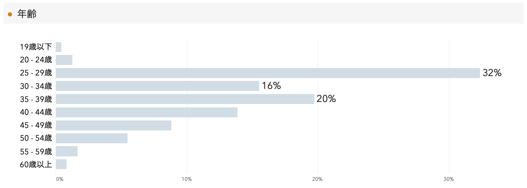 最も割合の多い年齢帯は25〜29歳で32%(前月比2ptアップ)、次に多い割合は35〜39歳の20%、続いて30〜34歳で16%と続きます。