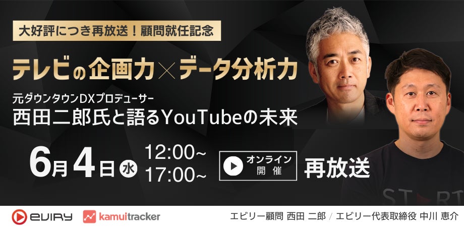 株式会社エビリー(本社:東京都渋谷区、代表取締役社長:中川恵介 以下、エビリー)は、2025年5月20日に開催し、大変ご好評をいただいた顧問就任記念トークイベント「テレビの企画力×データ分析力 元ダウンタウンDXプロデューサーの西田二郎氏と語るYouTubeの未来」の再放送を決定いたしましたので、お知らせします。