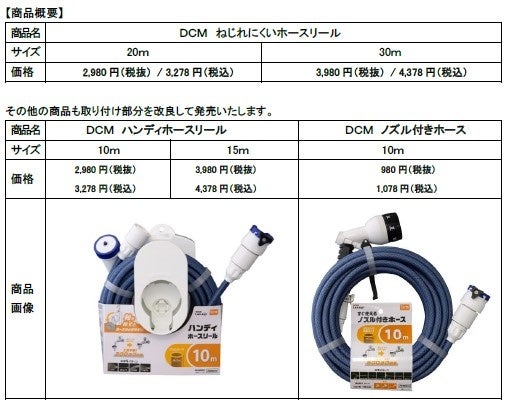 全国でホームセンター事業を展開するDCM株式会社( 東京都品川区、代表取締役社長: 石黒靖規以下、DCM)は、現行の蛇口への取り付け金具を変更し、簡単に脱着ができるようになった「DCM ねじれにくいホースリール」を 2022 年 2月 25 日 (金) より、全国のDCMグループ店舗(DCMカーマ・DCMダイキ・DCMホーマック・DCMサンワ・DCMくろがねや及びケーヨー デイツー、一部店舗を除く)にてリニューアル発売します。