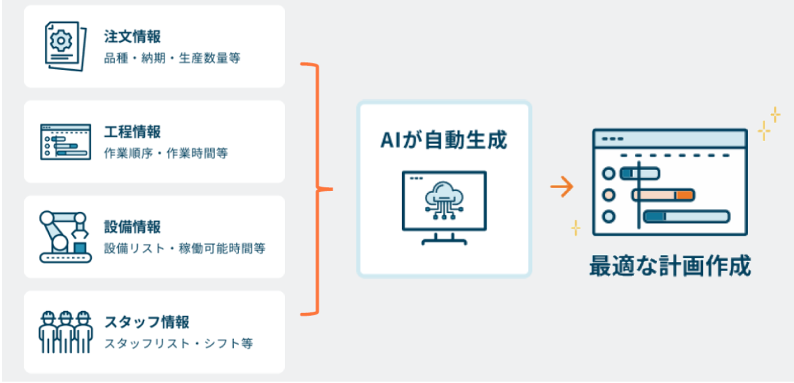 生産計画・管理のDXを支援するAI×SaaSサービス(生産計画自動立案システム)です。