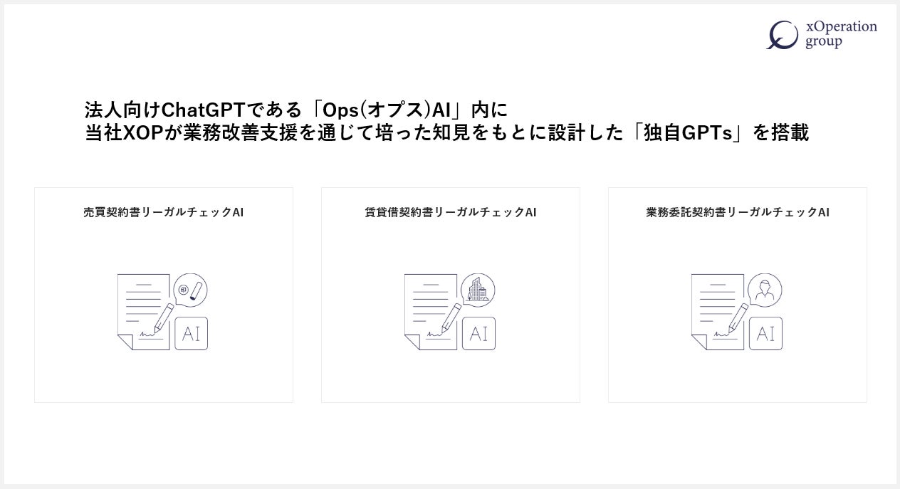 先端技術と業務(Ops)の融合に強みを持ち、生成AIを活用した業務改善支援を行う株式会社クロス・オペレーショングループ(東京都千代田区、代表取締役:田中亮大、以下XOP)は、自社で開発する法人向けChatGPT「OpsAI」(オプスAI)内に、独自プロンプトを搭載させたGPTsとして、【売買契約書リーガルチェックAI】【賃貸借契約書リーガルチェックAI】【業務委託契約書リーガルチェックAI】の提供を開始したことをお知らせいたします。