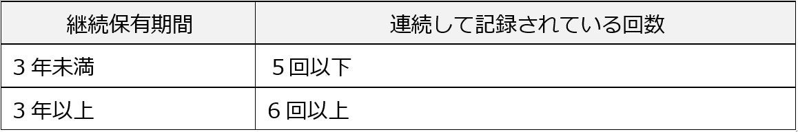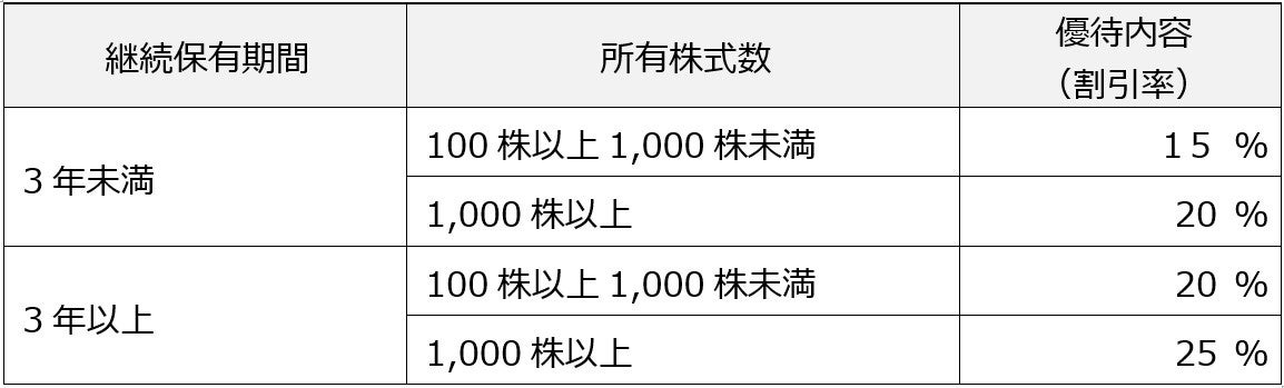 ※1 継続保有の判定は、基準日(毎年3月末日および9月末日)において、「同一株主番号」にて過去に遡って3月末日及び9月末日の当社株主名簿に、連続して記載または記録されていることを指します。例えば、100株を3年以上保有し、1,000株に買い増したときは、基準日における区分(1,000株以上)の継続保有期間は3年未満となりますが、同一の株主番号である限り、元の100株を3年以上保有していますので、25%の割引率を適用いたします。なお、継続保有のカウントは2025年9月末日を初回とします。