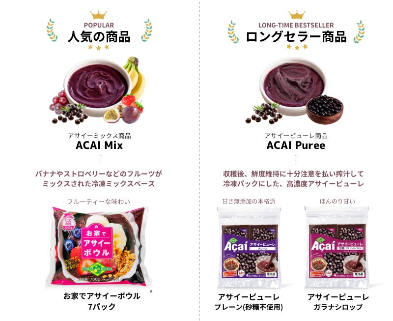 ブラジルのトメアス総合農業協同組合(CAMTA)よりおもにアグロフォレストリーで栽培されたアマゾンフルーツ原料を輸入し、メーカーや外食チェーンへ販売を行うほか、「ナチュラル・新鮮・おいしい・本物」をモットーとする自社製品の製造と販売などを展開。