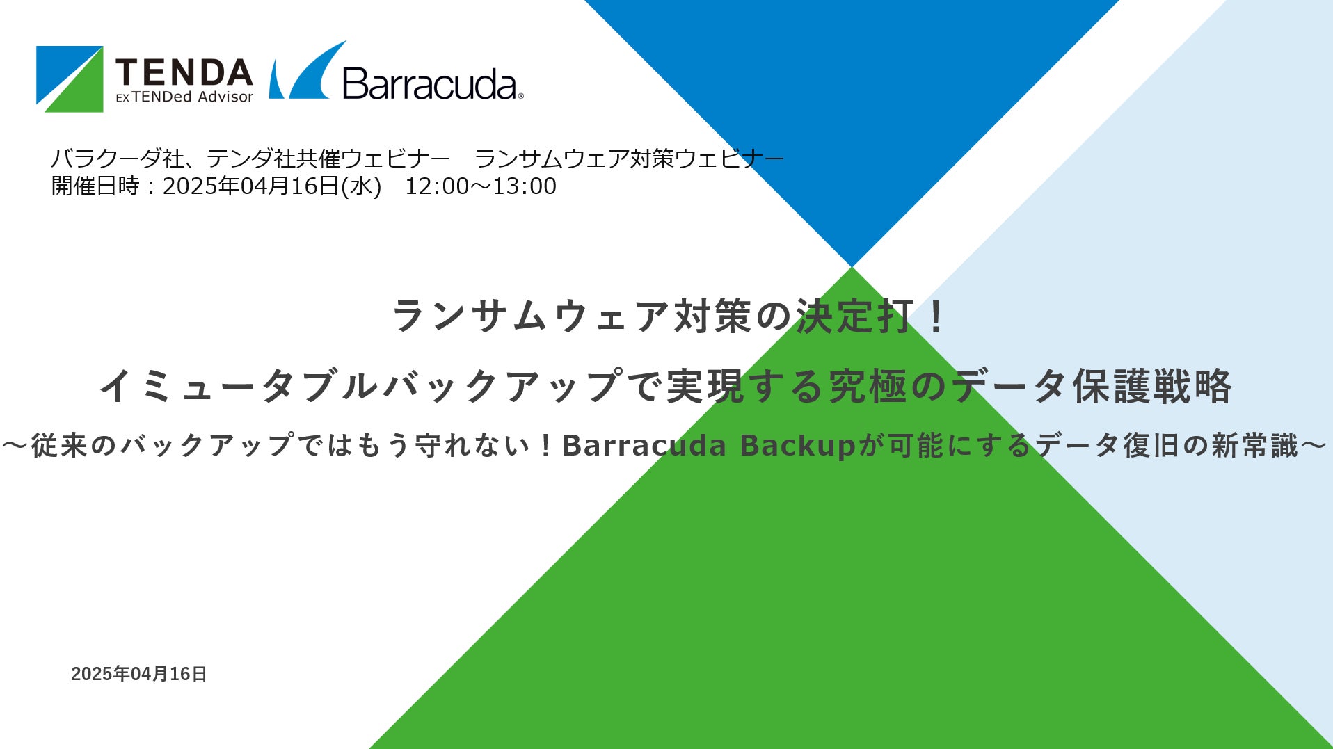株式会社テンダ(本社/東京都渋谷区、代表取締役会長/小林 謙、以下「テンダ」)は、2025年4月16日(水)に、バラクーダネットワークスジャパン株式会社(本社/東京都品川区、執行役員社長/鈴木 真、以下「バラクーダ社」)と共催で「ランサムウェア対策の決定打!イミュータブルバックアップで実現する究極のデータ保護戦略」と題してランサムウェア攻撃対策についてのウェビナーを開催いたします。