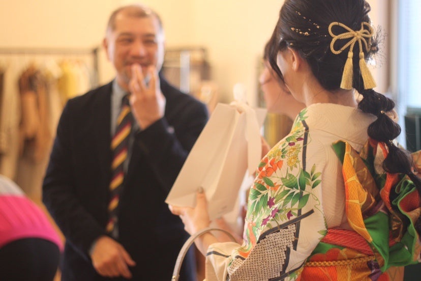 最初は緊張の面持ちだった女性たちも、美しい着物を着付けられ、ヘアメイクを施されると笑顔が戻り、サプライズでのLaline(ラリン)からのプレゼントを下地社長より贈呈されると溢れんばかりの笑顔になり、「幸せです!」と大喜びでした。