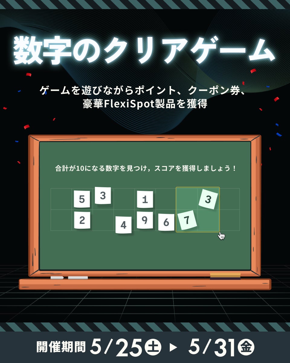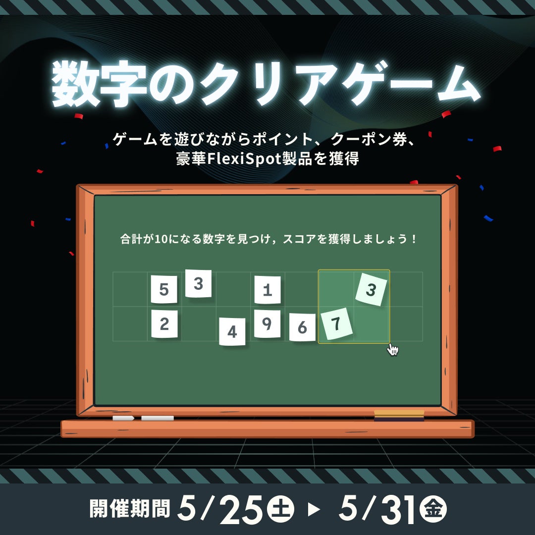 数字のクリアゲームを遊んで、FlexiSpot会員ポイント、クーポン券、豪華FlexiSpot製品を獲得できます。